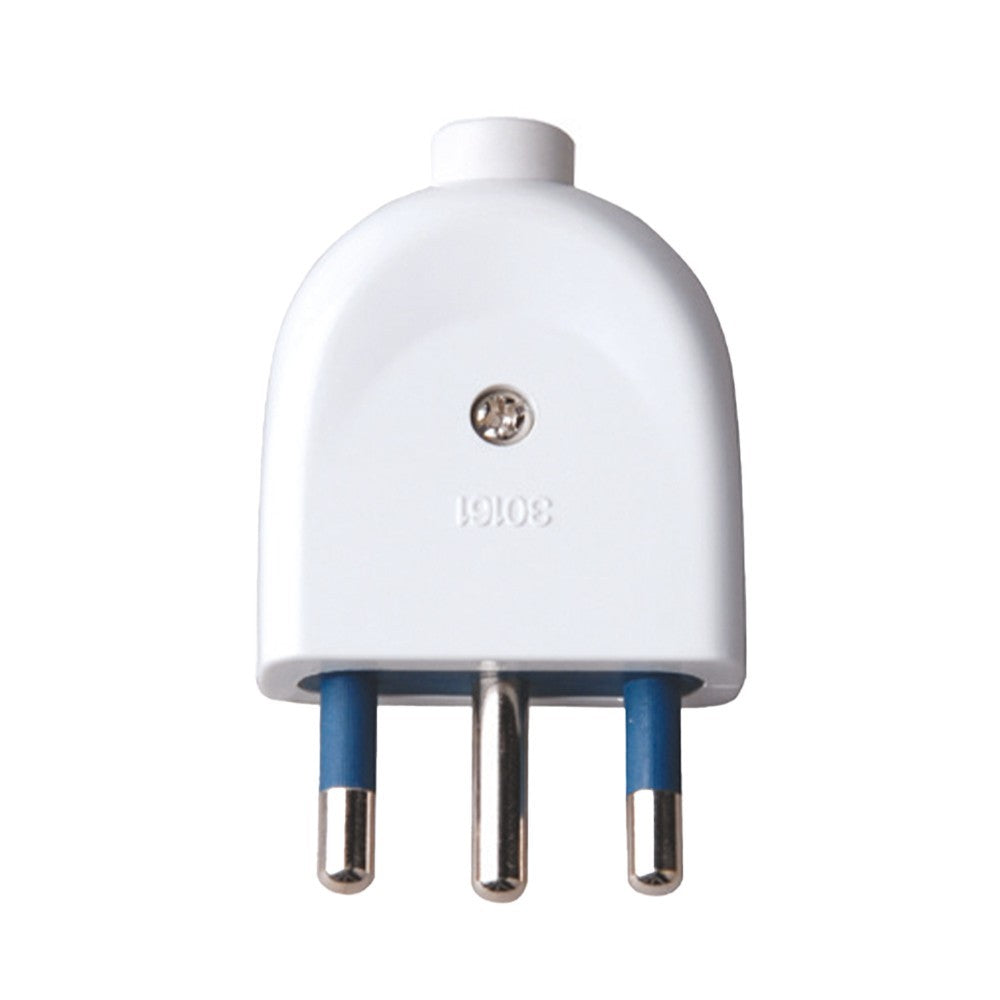 Spina singola 16A 2P+T con morsetti a vite e passacavo con uscita dritta. Corpo di colore bianco.